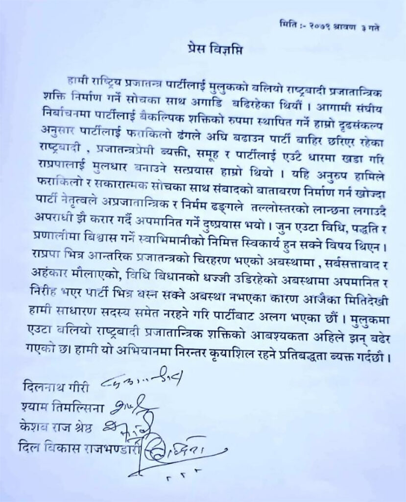 नेताहरु दिलनाथ गिरी, श्याम तिमल्सिना, केशवराज श्रेष्ठ र दिलविकास राजभण्डारीले मंगलबार एक विज्ञप्ति जारी गरी पार्टी छाडेको बताएका छन् ।