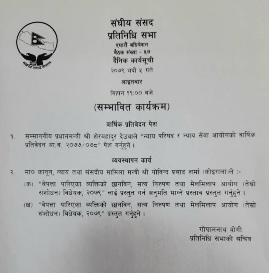 त्यसैगरी ‘बेपत्ता पारिएका व्यक्तिको छानविन सत्य निरुपण तथा मेलमिलाप आयोग (तेस्रो संशोधन) विधेयक, २०७९’ प्रस्तुत हुने संसद् सचिवालयले जारी गरेको सम्भावित कार्यसूचीमा उल्लेख छ ।