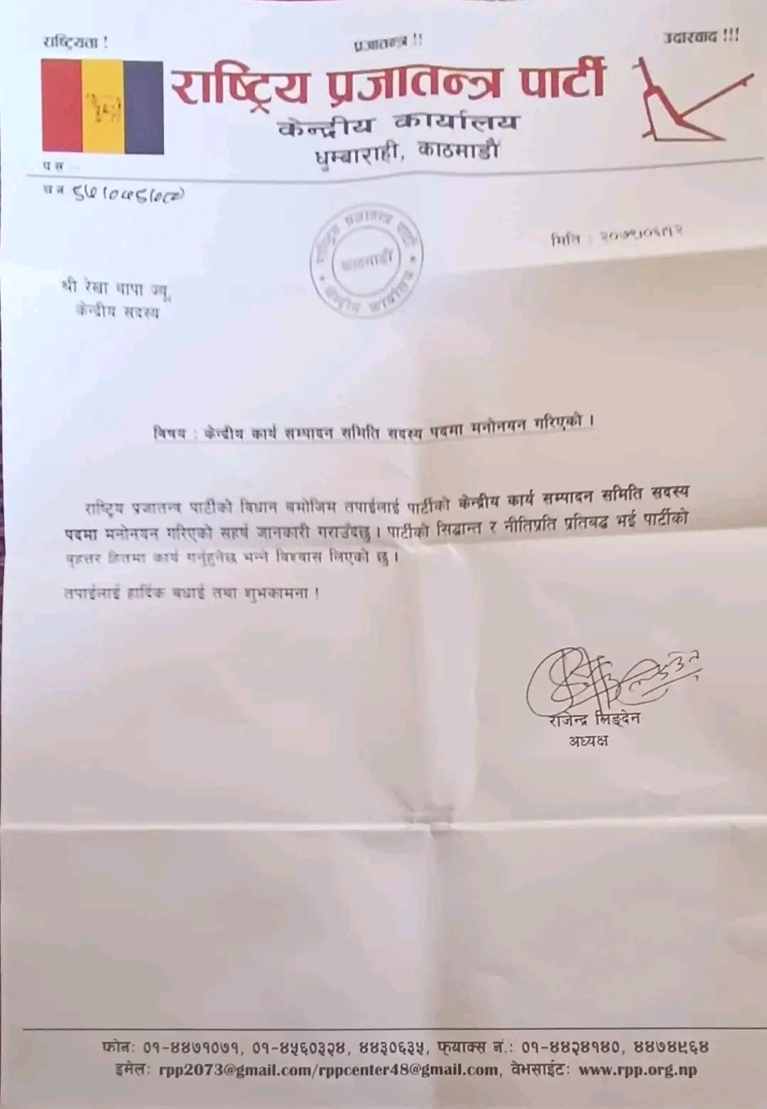 मंगलबार पार्टी अध्यक्ष राजेन्द्र लिङ्देनले थापालाई केन्द्रीय कार्यसम्पादन समिति सदस्यमा मनोनयन गरेका हुन् ।