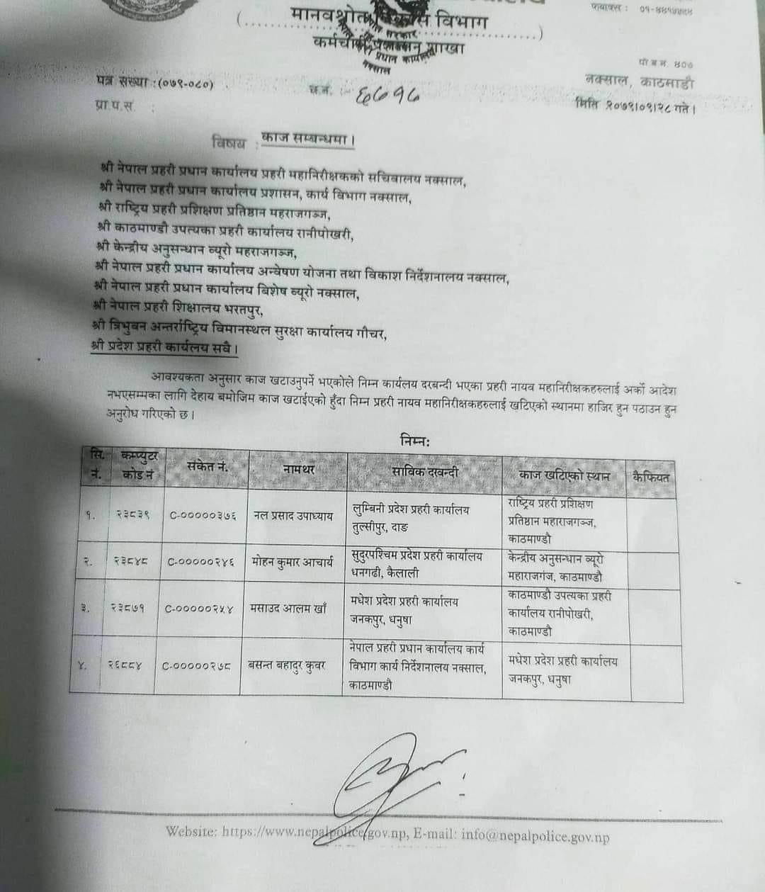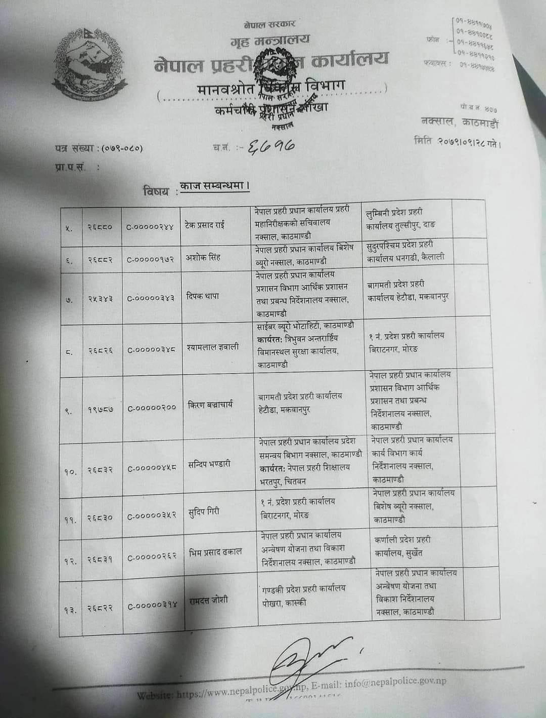 बिहीबार भएको सरुवा अनुसार प्रहरी प्रधान कार्यालय, नक्सालमा कार्यरत डीआईजी बसन्तबहादुर कुँवरलेमधेश प्रदेश प्रहरी कार्यालयको जिम्मेवारी पाएका छन् ।मधेशका प्रहरी प्रमुख मसाउद आलम खाँ उपत्यकाप्रहरी कार्यालय, रानीपोखरी आएका छन् कर्णाली प्रदेशका पोषराज पोख्रेल प्रहरी महानिरीक्षककोसचिवालयमा आएका छन् भने भीमप्रसाद ढकाल कर्णाली प्रदेश पठाइएका छन्।प्रहरी प्रधान कार्यालयकाडीआईजी दीपक थापा बागमती प्रदेश प्रहरी कार्यालय, हेटौंडामा खटाइएका छन् ।अशोक सिंहले सुदूरपश्चिमप्रदेश प्रहरी कार्यालय, धनगढीको जिम्मा पाएका छन् प्रहरी प्रवक्ता रहेका टेकप्रसाद राईले लुम्बिनी प्रदेशप्रहरी कार्यालय, दाङको जिम्मा पाएका छन् ।गण्डकी प्रदेशको नेतृत्व बुद्धिराज गुरुङले पाएका छन्