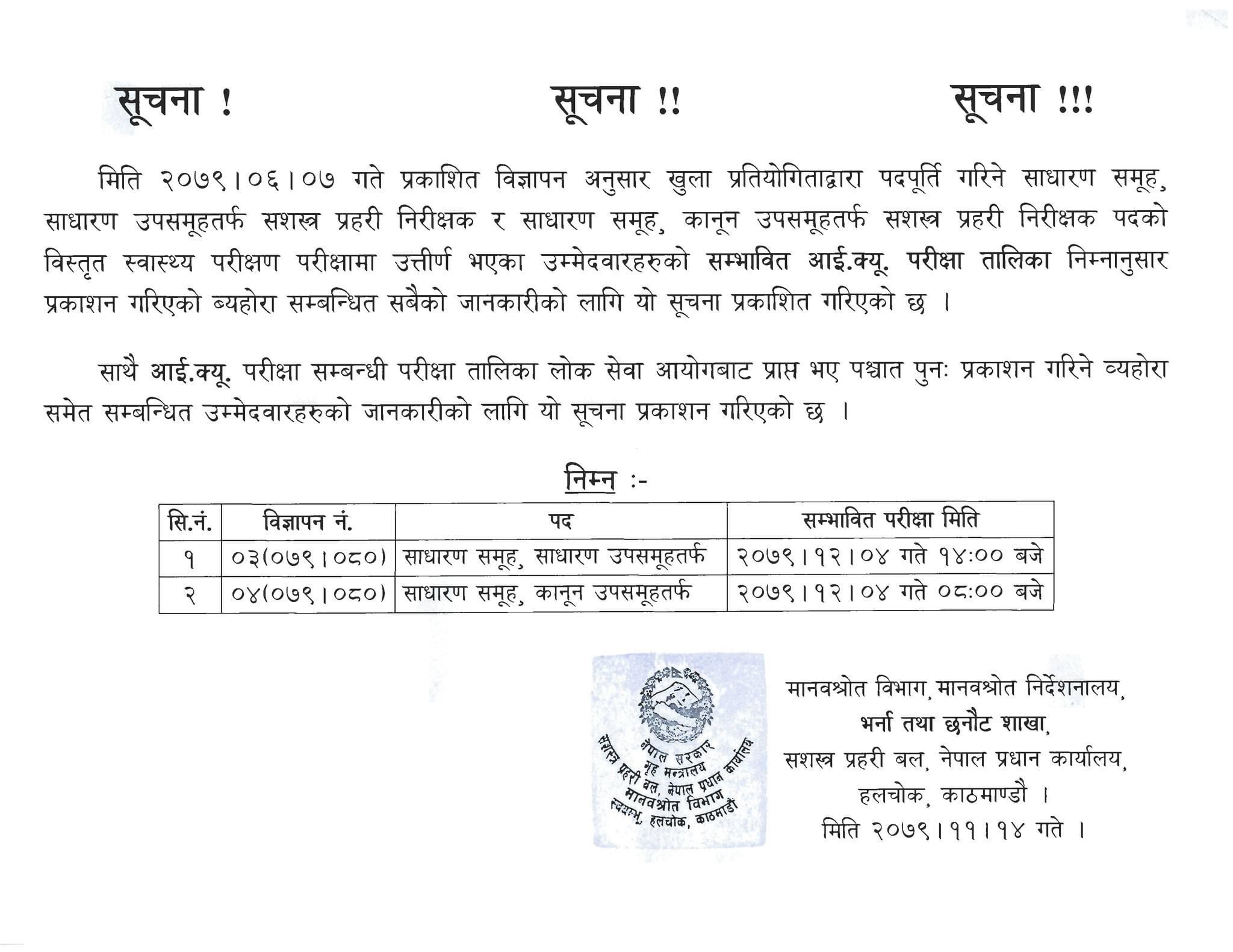 2. सशस्त्र प्रहरी निरीक्षक (साधारण समूह, साधारण उपसमूहतर्फ र साधारण समूह, कानुन उपसमूहतर्फ) पदको सम्भावित आई.क्यु. परीक्षा तालिका सम्बन्धी सूचना।