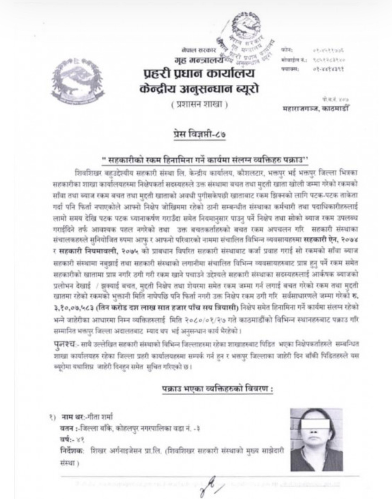 शिवशिखर बहुउद्देश्यीय सहकारी संस्था लि. केन्द्रीय कार्यालय, कौशलटार, भक्तपुर भई भक्तपुर जिल्लाभित्रका सहकारीका शाखा कार्यालयहरुमा निक्षेपकर्ता सदस्यहरुले उक्त संस्थामा बचत तथा मुद्दती खाताखोली जम्मा गरेको रकमको साँवा तथा ब्याज रकम बचत तथा मुद्दती खाताको अवधी पुगीसकेपछी खाताबाटरकम झिक्नको लागि पटक–पटक ताकेता गर्दा पनि फिर्ता नपाएकोले आफ्नो निक्षेप जोखिममा रहेको ठानीसम्बन्धीत संस्थाका कर्मचारी तथा पदाधिकारीहरुलाई लामो समय देखि पटक पटक ध्यानाकर्षण गराउँदासमेत नियमानुसार पाउनु पर्ने निक्षेप तथा सोको ब्याज रकम उपलब्ध गराईदिने तर्फ आवश्यक पहल नगरेकोतथा उक्त बचतकर्ताहरुको बचत रकम अपचलन गरि सहकारी संस्थाका संचालकहरुले सुनियोजित रुपमाआफु र आफनो परिवारको नाममा संचालित विभिन्न व्यवसायहरुमा सहकारी ऐन, २०७४ र सहकारीनियमावली, २०७५ को प्रावधान विपरित सहकारी संस्थाबाट कर्जा प्रवाह गराई सो रकमको साँवा ब्याजसहकारी संस्थामा नबुझाई तथा सहकारी संस्थाको लगानीमा संचालित विभिन्न व्यवसायहरुबाट प्राप्त हुनु पर्नेरकम समेत सहकारीको खातामा प्राप्त नगरि ठगी गरी रकम खाने पचाउने उद्देश्यले सहकारी संस्थाकासदस्यहरुलाई आर्कषक ब्याजको प्रलोभन देखाई / झुक्याई बचत, मुद्दती निक्षेप तथा शेयरमा समेत रकमजम्मा गर्न लगाई बचत गरेको रकम तथा मुद्दती खातमा रहेको रकमको भुक्तानी मिति नाघेपछि पनि फिर्ता नगरीउक्त निक्षेप रकम ठगी गरि सर्वसाधारणले जम्मा गरेको रु. ३,१०,०७,५८३ (तिन करोड दश लाख सात हजारपाँच सय त्रियासी) निक्षेप समेत हिनामिना गर्ने कार्यमा संलग्न रहेको भन्ने जाहेरीका आधारमा निम्नव्यक्तिहरुलाई मिति २०८०/०१/२७ गते काठमाडौंको विभिन्न स्थानहरुबाट पक्राउ गरि सम्मानित भक्तपुरजिल्ला अदालतबाट म्याद थप भई अनुसन्धान कार्य भैरहेको ।
