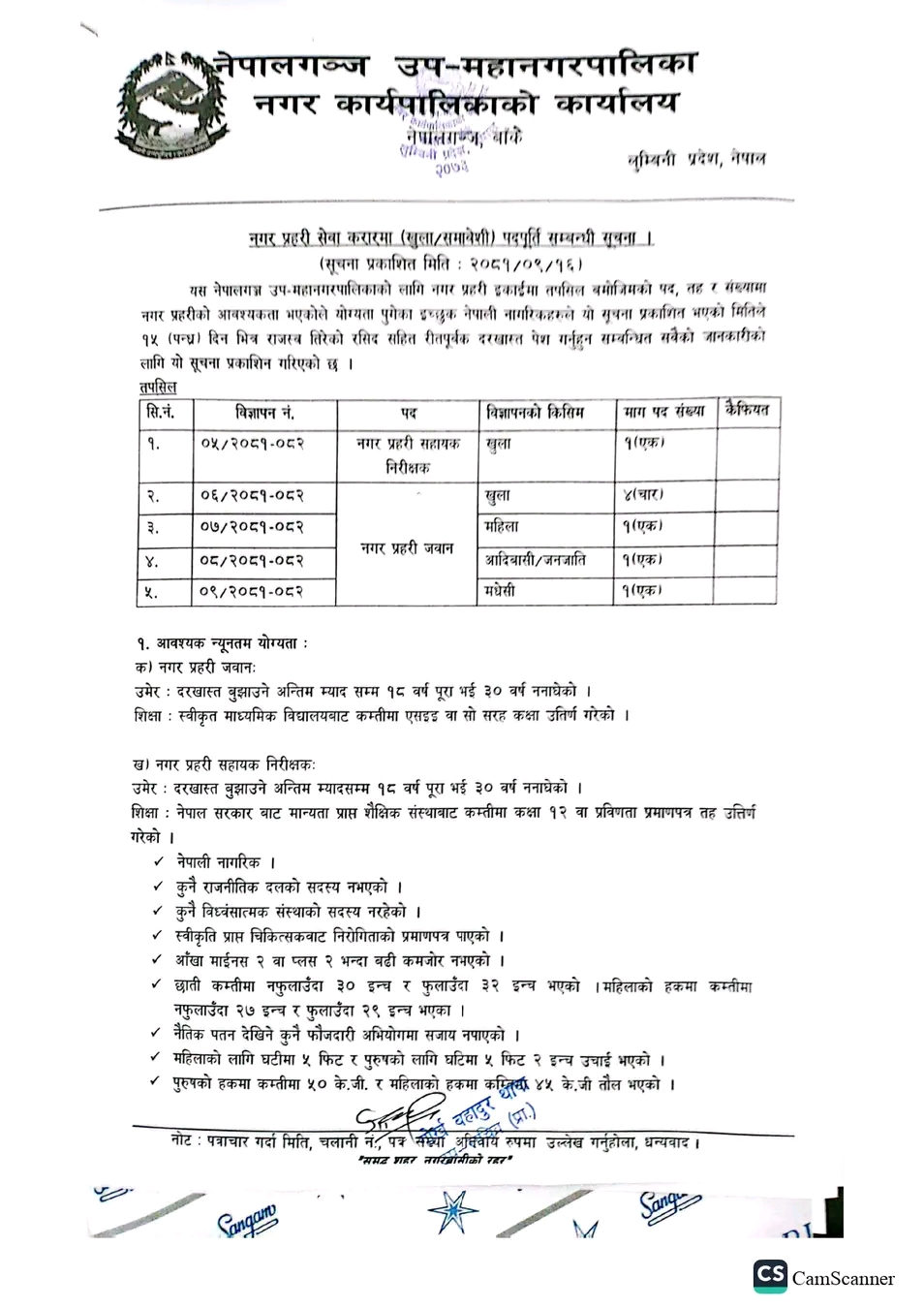 बाँके । नेपालगञ्ज उप-महानगरपालिकाले नगर प्रहरी इकाईमा कर्मचारी दरखास्त आह्वान गरेको छ ।