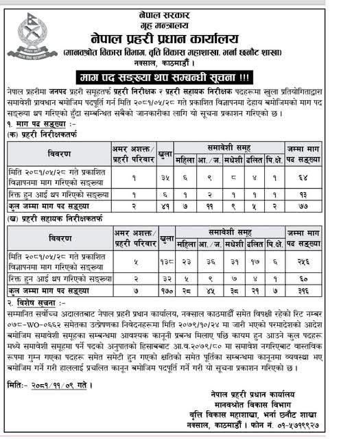 प्रहरी निरीक्षकका लागि ६४ जनाको माग गरिएकोमा थप १३ पद थप गरी कुल ७७ जनाका लागि अवसर खुला गरिएको छ। त्यसैगरी, प्रहरी सहायक निरीक्षक पदमा २५६ जनाको माग गरिएकोमा ६० जना थप गरी कुल ३१६ पद खुला गरिएको छ।