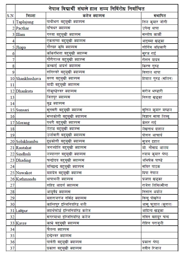 यो चुनावमा केही क्याम्पसहरूमा सर्वसम्मत नेतृत्व चयन भयो । गत विभिन्न दलका विद्यार्थी संगठनहरू एक्लाएक्लै लडे भने कतै गठबन्धन बनाएर निर्वाचनमा होमिए ।