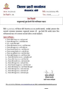 рдЬрд┐рд▓реНрд▓рд╛ рдкреНрд░рд╣рд░реА рдХрд╛рд░реНрдпрд╛рд▓рдп рдмрд╛рдБрдХреЗрджреНрд╡рд╛рд░рд╛ рдЬрд╛рд░реА рдкреНрд░реЗрд╕ рд╡рд┐рдЬреНрдЮрдкреНрддрд┐рдЕрдиреБрд╕рд╛рд░ рдиреЗрдкрд╛рд▓рдЧрдЮреНрдЬ рдЙрдкрдорд╣рд╛рдирдЧрд░рдкрд╛рд▓рд┐рдХрд╛ рдЕрдиреНрддрд░реНрдЧрдд рдмрд╕рдкрд╛рд░реНрдХ, рдзрдореНрдмреЛрдЬреА, рдкреБрд╖реНрдкрд▓рд╛рд▓ рдЪреЛрдХ рд▓рдЧрд╛рдпрддрдХрд╛ рд╕реНрдерд╛рдирд╣рд░реВрдмрд╛рдЯ рдпрд╛рддреНрд░реБрд╣рд░реВрд▓рд╛рдИ рд╣реИрд░рд╛рдиреА рджрд┐рдиреЗ, рдЬрдмрд░реНрдЬрд╕реНрддреА рд╕рд╡рд╛рд░реА рдЪрдврд╛рдЙрди рдЦреЛрдЬреНрдиреЗ рддрдерд╛ рдЕрд╡реНрдпрд╡рд╕реНрдерд┐рдд рдЧрддрд┐рд╡рд┐рдзрд┐ рдЧрд░реНрдиреЗ рд╡реНрдпрдХреНрддрд┐рд╣рд░реВрд▓рд╛рдИ рдирд┐рдпрдиреНрддреНрд░рдгрдорд╛ рд▓рд┐рдЗрдПрдХреЛ рд╣реЛред