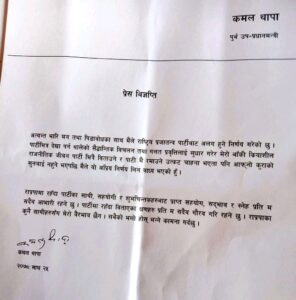 बाँके । राप्रपाका पूर्व–अध्यक्ष कमल थापाले पार्टी त्यागको घोषणा गरेका छन ।