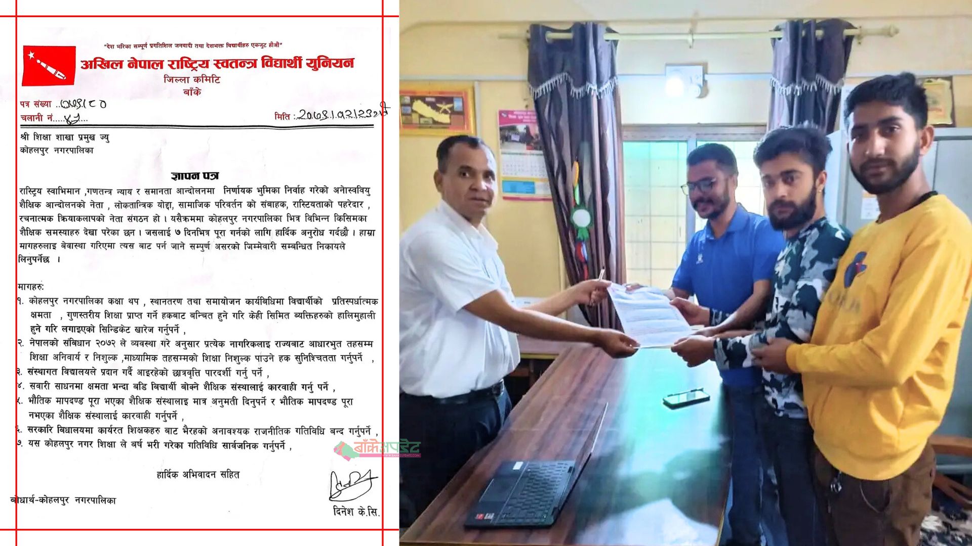 अनेरास्ववियु बाँकेले बुझायो ७ बुँदे मागसहित कोहलपुर शिक्षा शाखालाई ज्ञापनपत्र