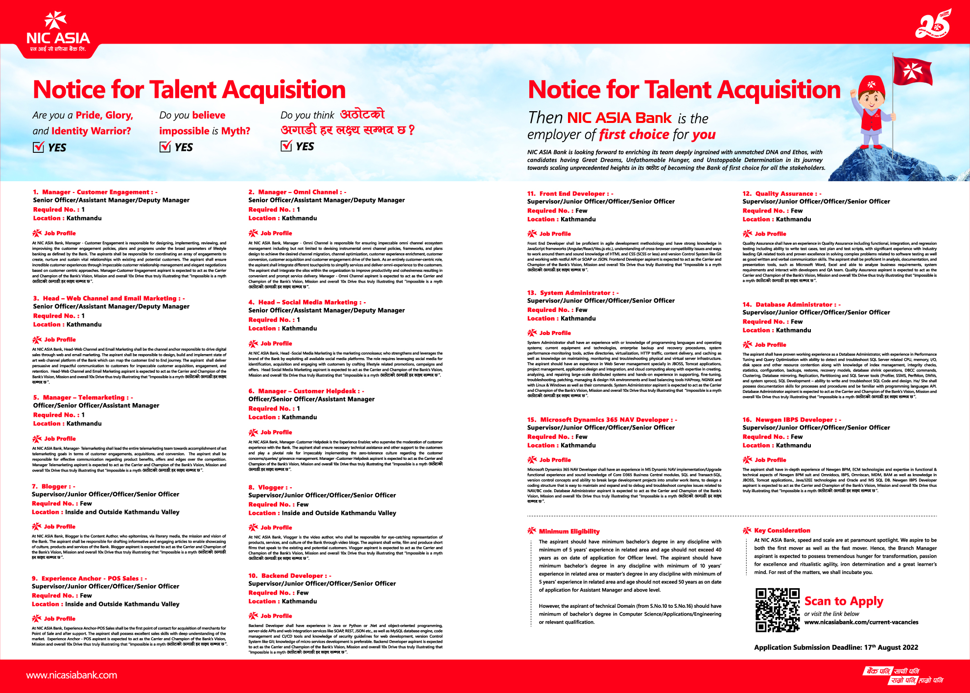 बैंकले डिजिटल बैंकिङ्ग, मार्केटिङ, आईटी, ब्लगर, भ्लगर लगायत दर्जनभन्दा बढी पदमा कर्मचारीहरु माग गरेको हो । यसका लागि इच्छुकले भाद्र १ गतेसम्म आवेदन दिन सक्ने व्यवस्था बैंकले गरेको छ ।