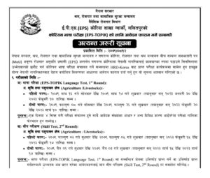 इच्छुक नेपाली नागरिकले भाषा परीक्षाका लागि निवेदन दिन सक्ने इपिएस कोरिया शाखा ग्वार्को ललितपुरले सूचना निकालेर जानकारी गराएको छ।