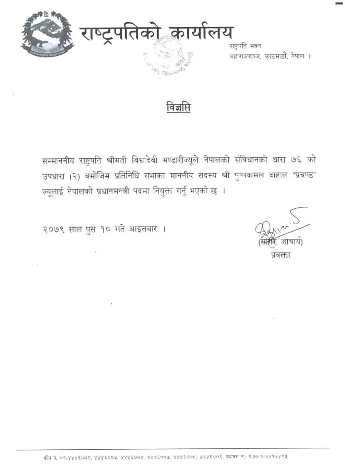 राष्ट्रपति विद्यादेवी भण्डारीले प्रचण्डलाई संविधानको धारा ७६ को उपधारा २ बमोजिम प्रधानमन्त्रीमा नियुक्त गरेकी हुन् ।