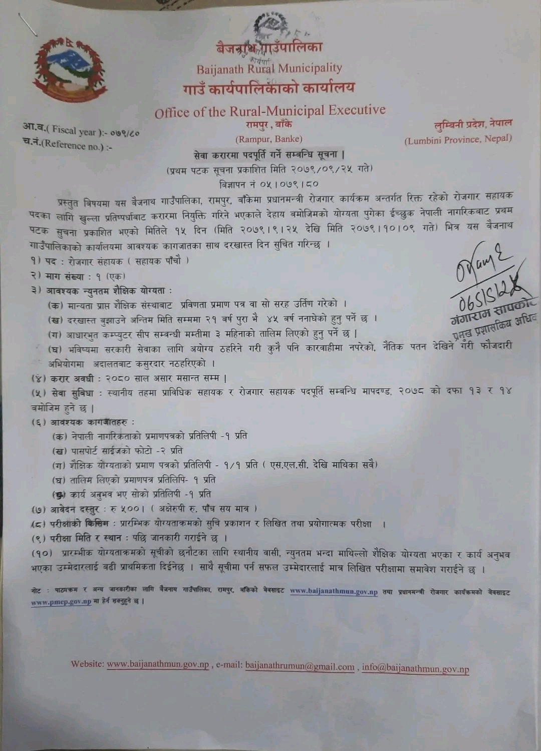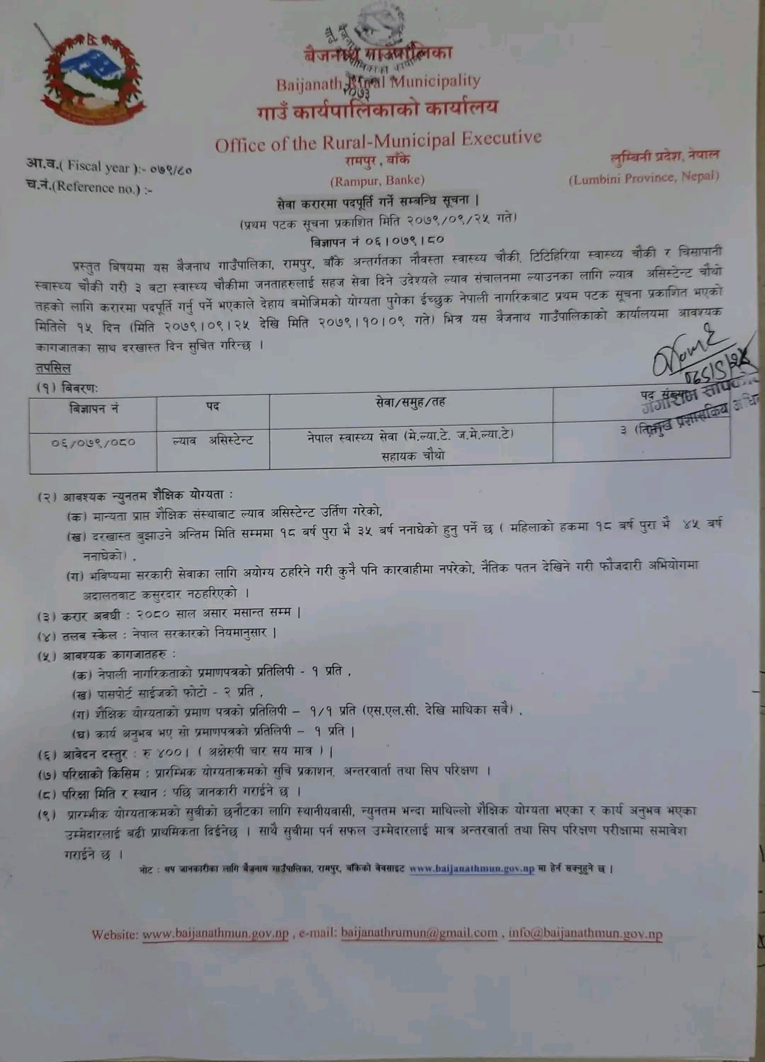 बाँके । बैजनाथ गाउँपालिकाले रोजगार सहायक र ल्याब असिस्टेन्ट चौथो तहको पदपूर्ति आह्वान गरेको छ ।