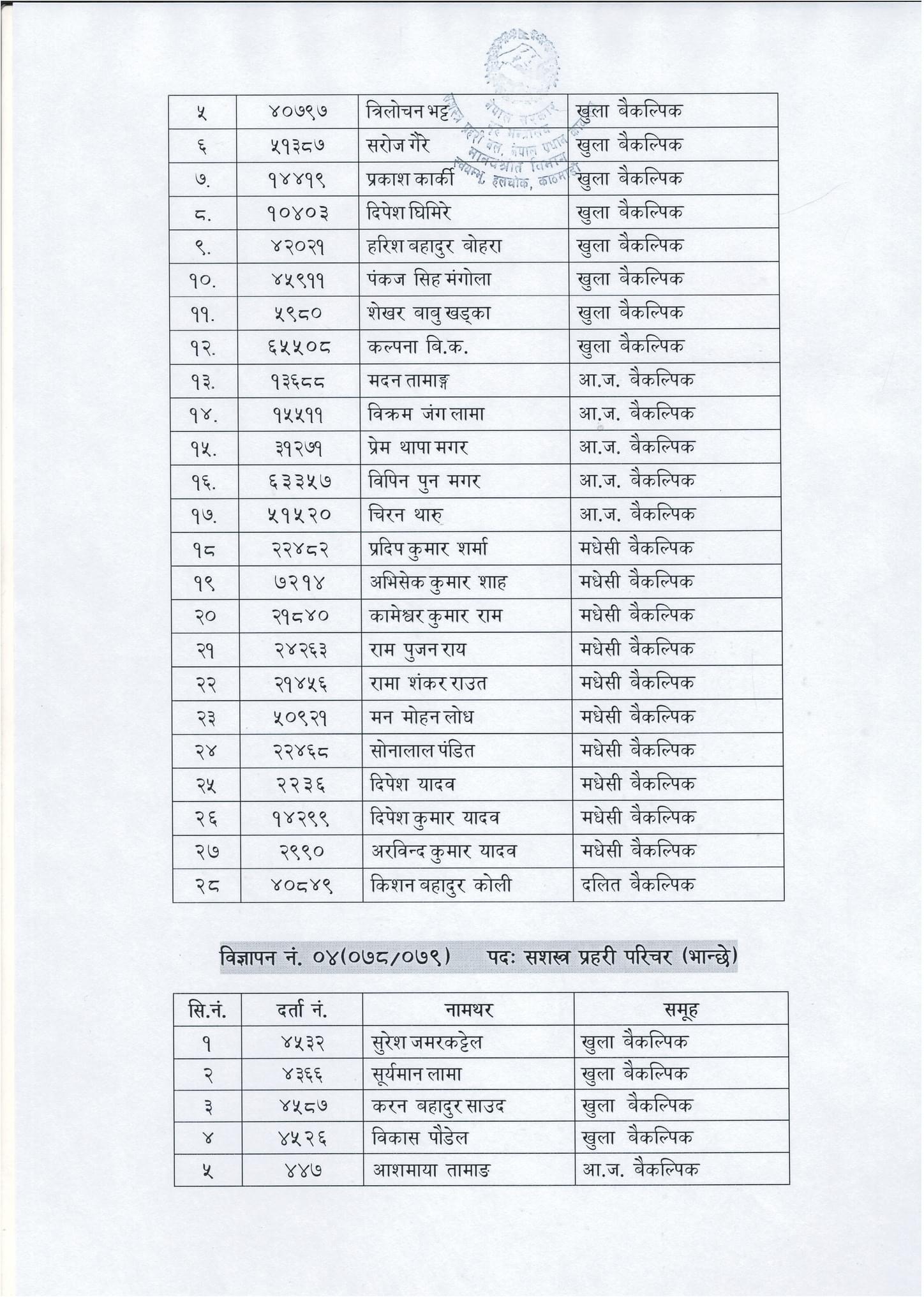सशस्त्र प्रहरी सहायक निरीक्षक, सशस्त्र प्रहरी जवान तथा सशस्त्र प्रहरी परिचर पदको बैकल्पिक उम्मेदवारहरुको नियुक्तिका लागि सिफारिस गरिएको सूचना: