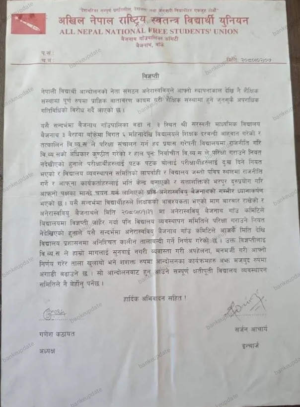 बाँके। बाँकेको बैजनाथ गाउँपालिका ३ स्थित श्री सरस्वती मावि वैरहवाको प्रशासन कार्यालयमा अनेरास्वबियुले ताला लगाएको छ ।