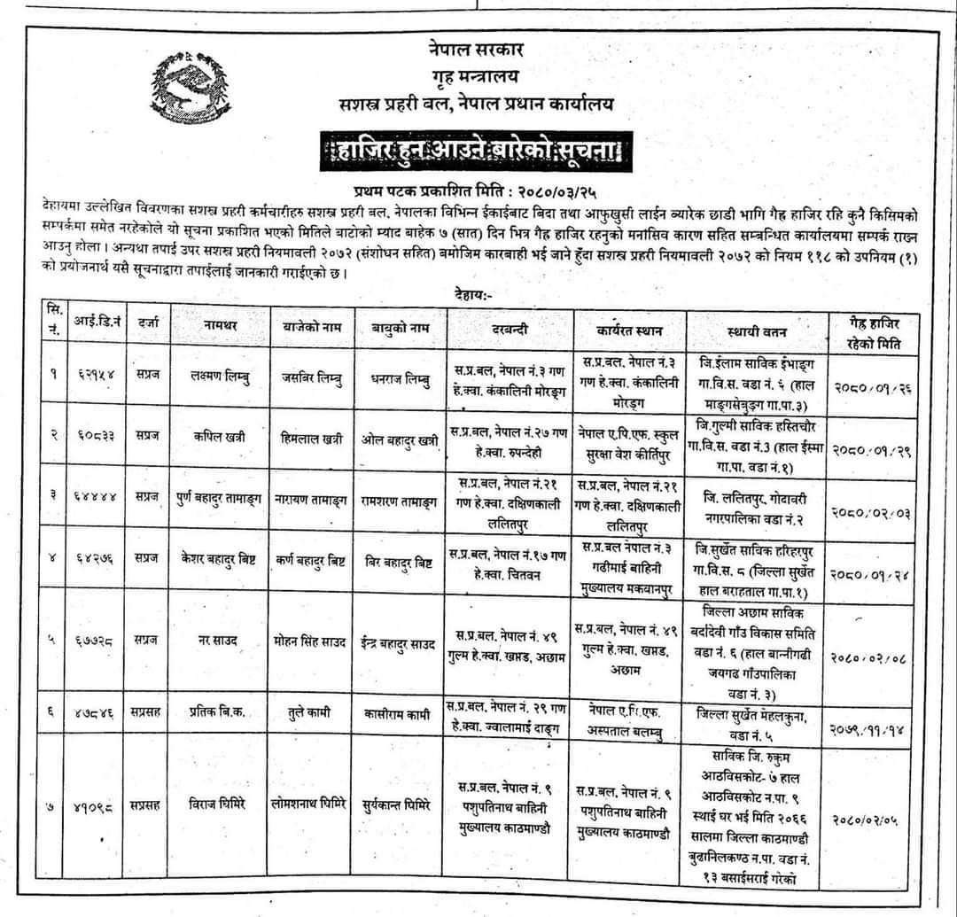हाजिर हुन नजानेहरू मा सशस्त्र प्रहरी बल नेपालको ३ नम्बर गणका जवान लक्ष्मण लिम्बु, २७ नम्बर गणकपिल खत्री, २१ नम्बर गण पूर्ण बहादुर तामाङ, १७ नम्बर गणका केशर बहादुर विष्ट, ४९ नम्बर गुल्मका नरसाउद, २९ नम्बर गणका सहायक प्रहरी हवलदार प्रतीक बिक र पशुपतिनाथ बाहिनी मुख्यालयका सहायकहवलदार बिराज घिमिरे छन् ।‘यो सूचना प्रकाशित भएको मितिले सात दिनभित्र आफू गैरहाजिर रहनुको कारणखोली सन्तोषजनक स्पष्टीकरण सहित कार्यालयमा हाजिर हुन आउनु होला,’ सूचनामा भनिएको छ, ‘अन्यथासशस्त्र प्रहरी नियमावली २०७२ को बमोजिम कारबाही हुनेछ सशस्त्र प्रहरी बल नेपाल ले जान्कारी दीयको छ ।