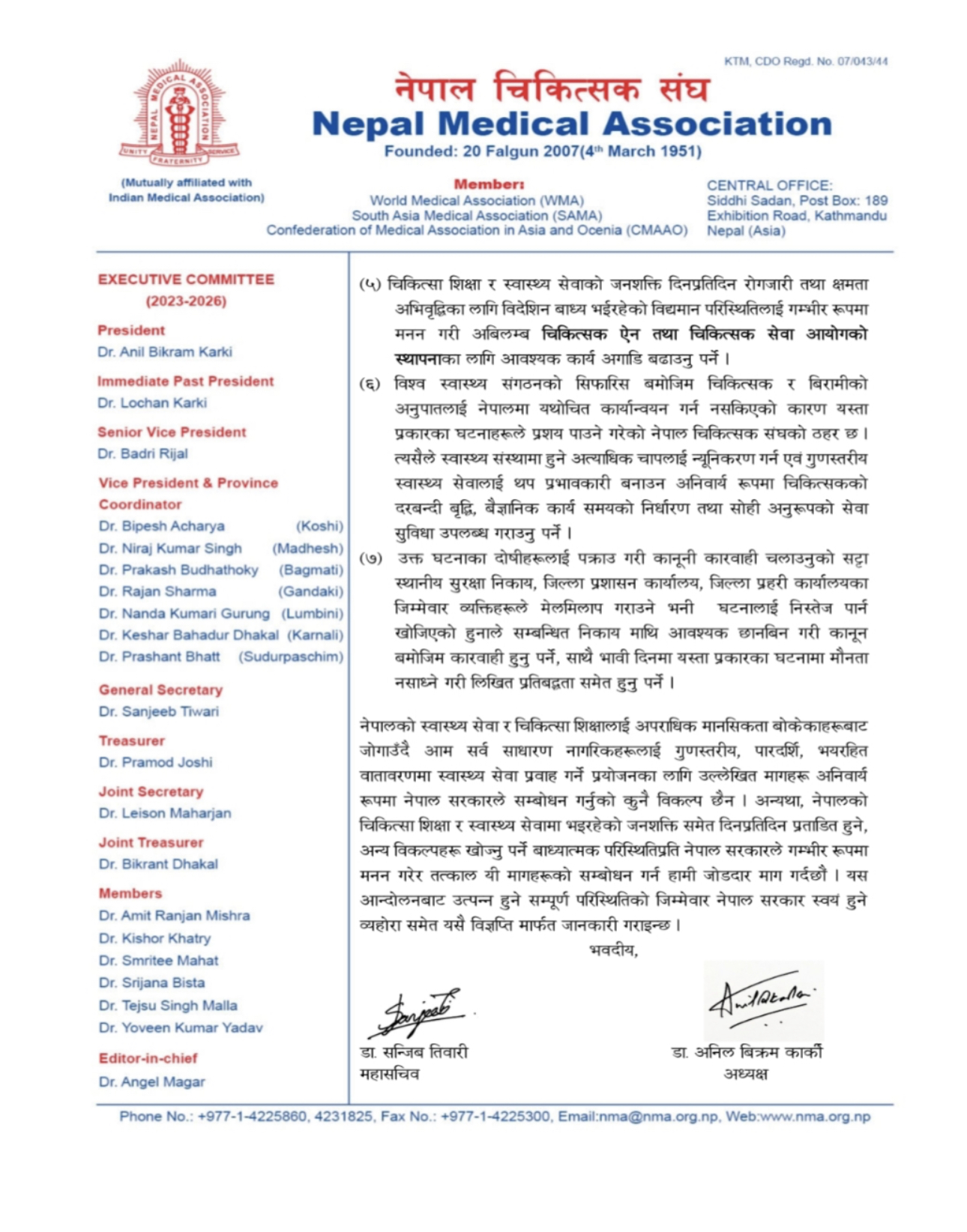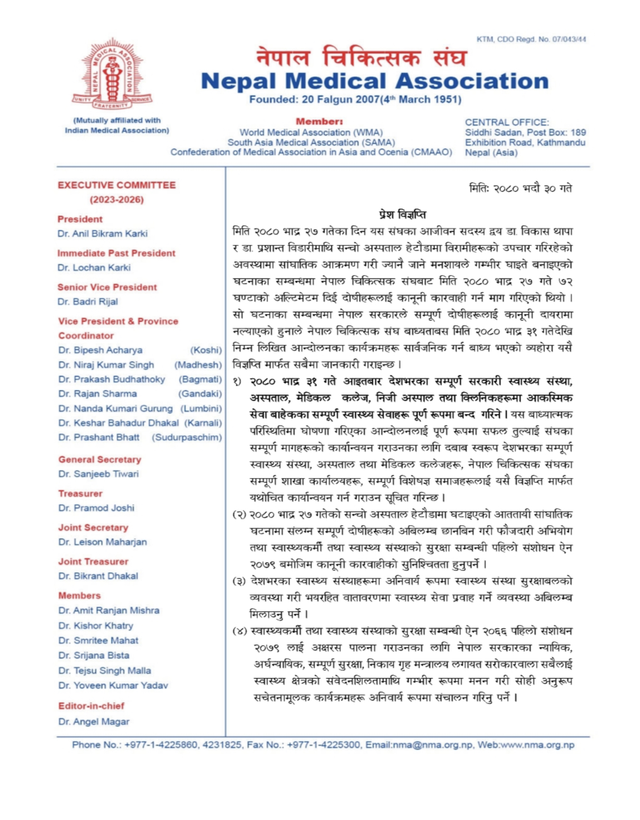 संघले आफ्ना मागहरु पूरा नभएको र आक्रमणकारीहरुलाई अझै कारबाही नभएको भन्दै आज ईमर्जेन्सी बाहेक सम्पुर्ण उपचार सेवाठप्प पार्नु परेको जनाएको हो।