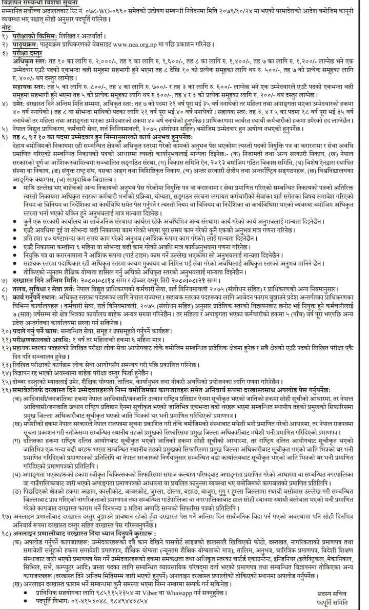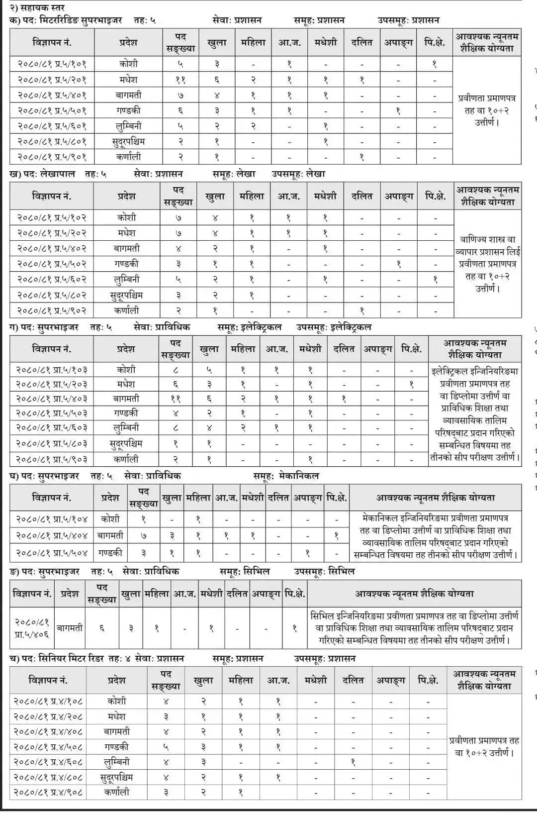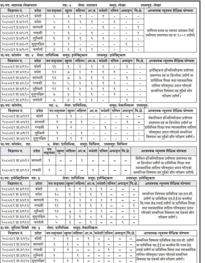 प्राधिकरणले विभिन्न प्रदेशका लागि मिटररिडिङ सुपरभाइजर, लेखापाल, सुपरभाइजर, सिनियर मिटर रिडर, सहायक लेखापाल, फोरमेन, इलेक्ट्रिसियन र जुनियर मिस्त्री लगायतका पदका लागि पनि दरखास्त आह्वान गरेको छ।
