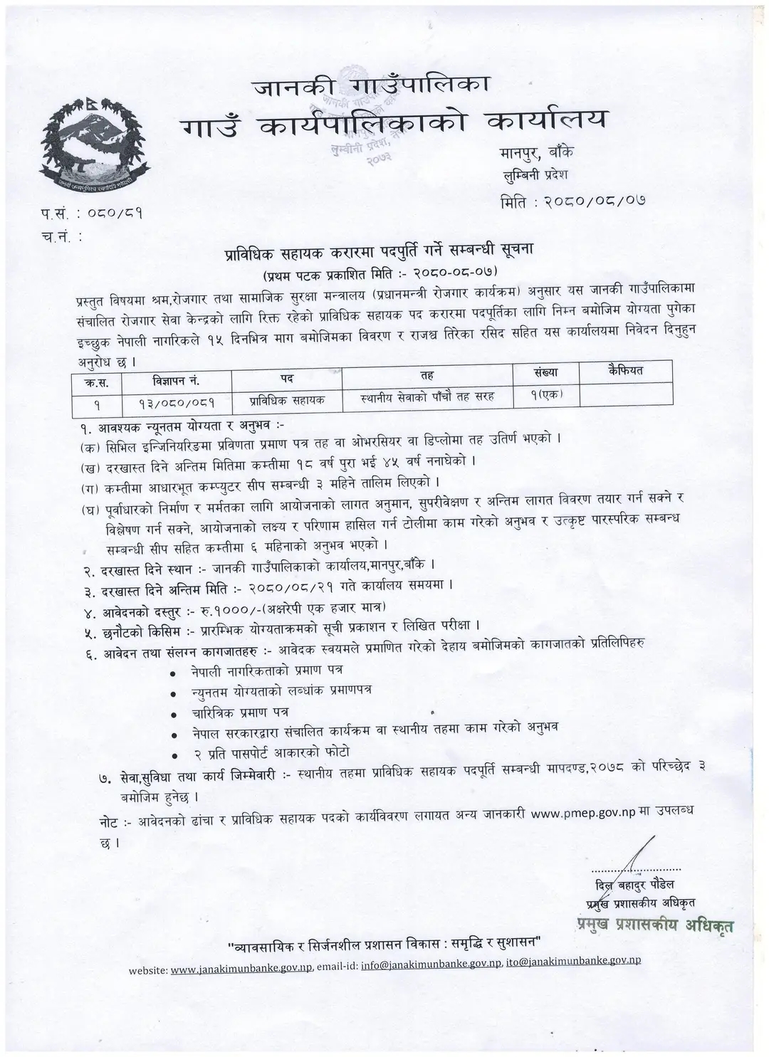 बाँके । बाँकेको जानकी गाउँपालिकाले प्राविधिक सहायक पदमा कर्मचारी माग गरेको छ ।
