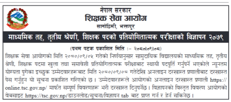 तर अंग्रेजी, गणित, विज्ञान, कार्यालय सञ्चालन तथा लेखा र कम्प्युटर विज्ञानमा फारम भर्न चाहनेले भने शिक्षा विषयको तालिम नलिए पनि दरखास्त दिन सक्नेछन्।