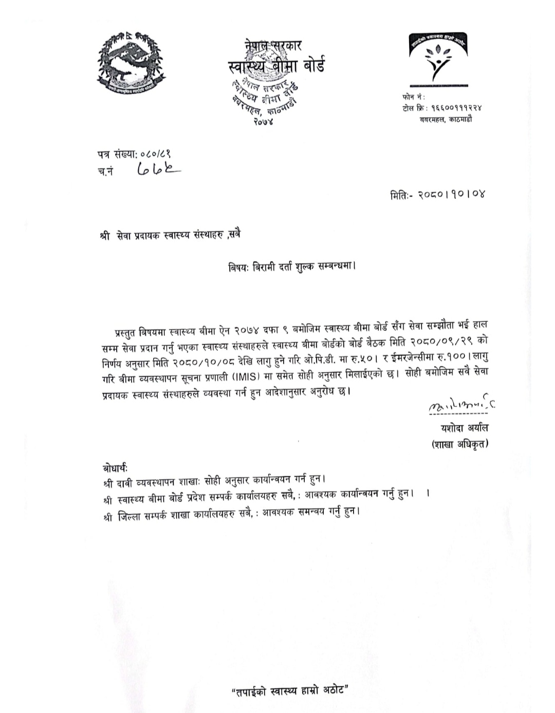 बोर्डका शाखा अधिकृत यशोदा अर्यालका अनुसार बोर्डले ओपिडी र इमर्जेन्सी शुल्क तोकी बिमा व्यवस्थापन सूचना प्रणालीमा मिलाइएको हो। निर्धारण गरिएको यसै अनुसारको शुल्क लागू गर्न बोर्डले सम्पूर्ण सेवा प्रदायक स्वास्थ्य संस्थाहरूलाई अनुरोधसमेत गरेको छ।