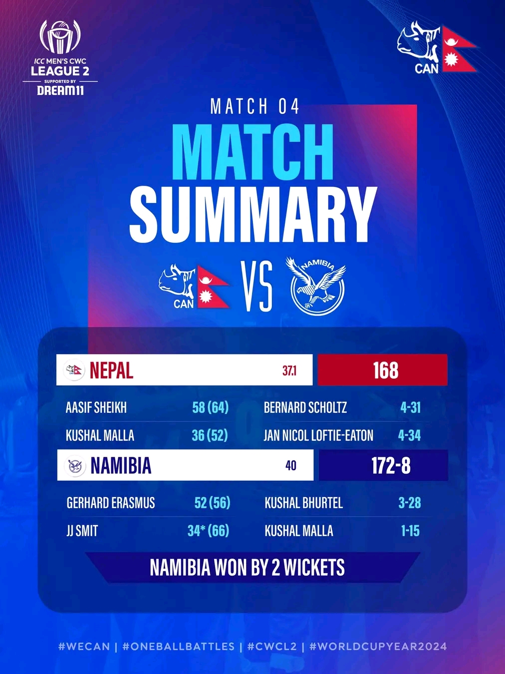 ६० बल छदैँ नामिबियाले ८ विकेट गुमाउँदै जित हासिल गरेको हो। कुशल भुर्तेलले ३, दिपेन्द्रसिंह ऐरी, रोहित पौडेल, कुशल मल्ल, ललित राजवंशीले समान एक एक विकेट लिए।