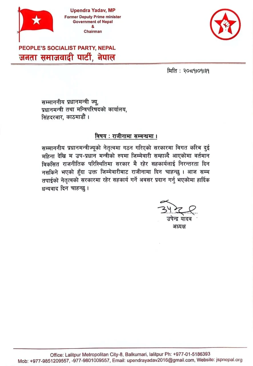 बाँके । उपप्रधान एवम् स्वास्थ्य तथा जनसंख्या मन्त्री उपेन्द्र यादवले पदबाट राजीनामा दिएका छन् । यस्तै वन तथा वातावरण राज्यमन्त्री दीपक कार्कीले पनि राजीनामा दिएका छन् ।