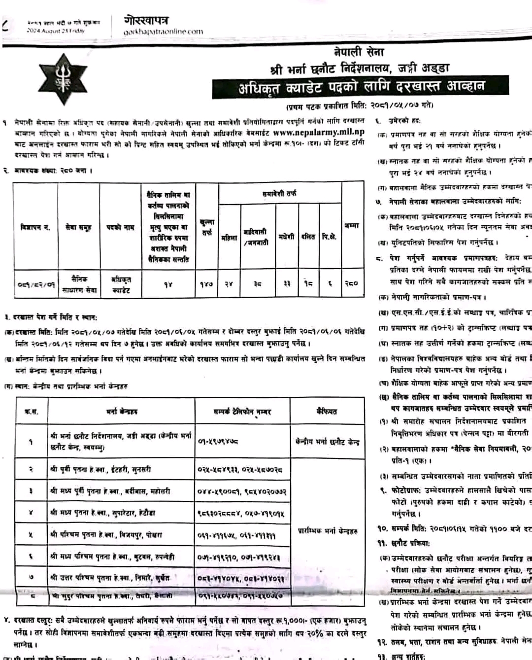 इच्छुक उम्मेदवारले असोज ५ गतेसम्म दरखास्त दिन सक्ने भर्ना छनौट निर्देशनालय जंगी अड्डाले जनाएको छ।