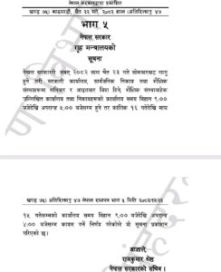 सोमबार बसेको मन्त्रिपरिषद् बैठकले गरेको निर्णयलाई गृह मन्त्रालयले आजै राजपत्रमा प्रकाशन गरी सूचना जारी गरी सरकारी कार्यालय, सार्वजनिक निकाय तथा शैक्षिक संस्थाहरूमा शनिबार र आइतबार बिदा दिने, शैक्षिक संस्थाबाहेक उल्लिखित कार्यालय तथा निकायहरूको कार्यालय समय यही चैत २३ गतेदेखि बिहान ९ः०० बजेदेखि अपराह्न ५ः०० बजेसम्म कायम हुने जनाएको हो ।