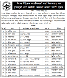 काउन्सिलले शुक्रबार एक सूचना जारी गर्दै नेपाल मेडिकल काउन्सिल ऐन २०२०, नियमावली २०२४ र नेपाल नागरिकता ऐन २०६३ बमोजिम ती चिकित्सकहरूको दर्ता खारेज गर्ने निर्णय भएको जनाएको छ। यो निर्णय सूचना प्रकाशित भएकै मितिदेखि लागू हुने भएको छ।