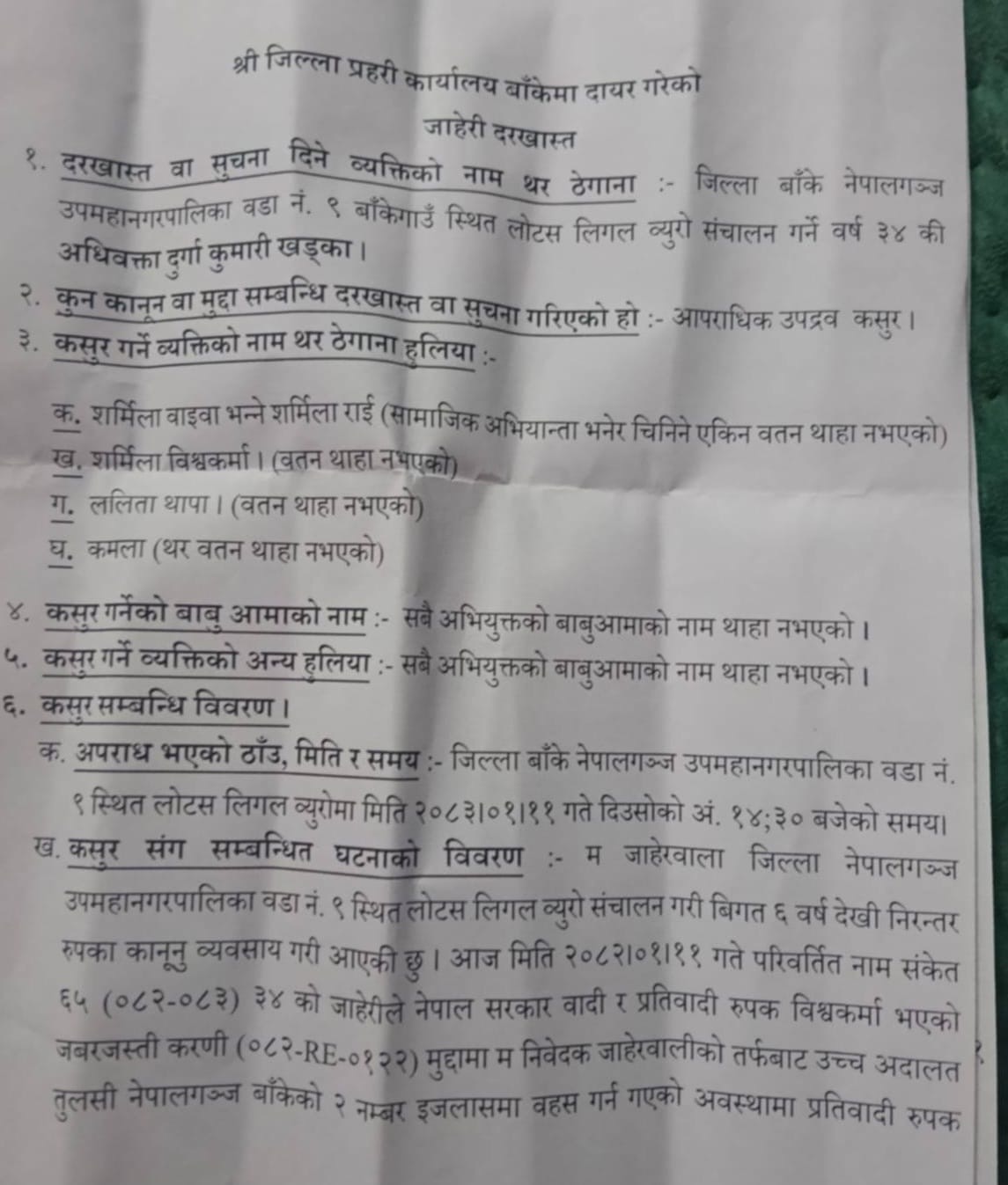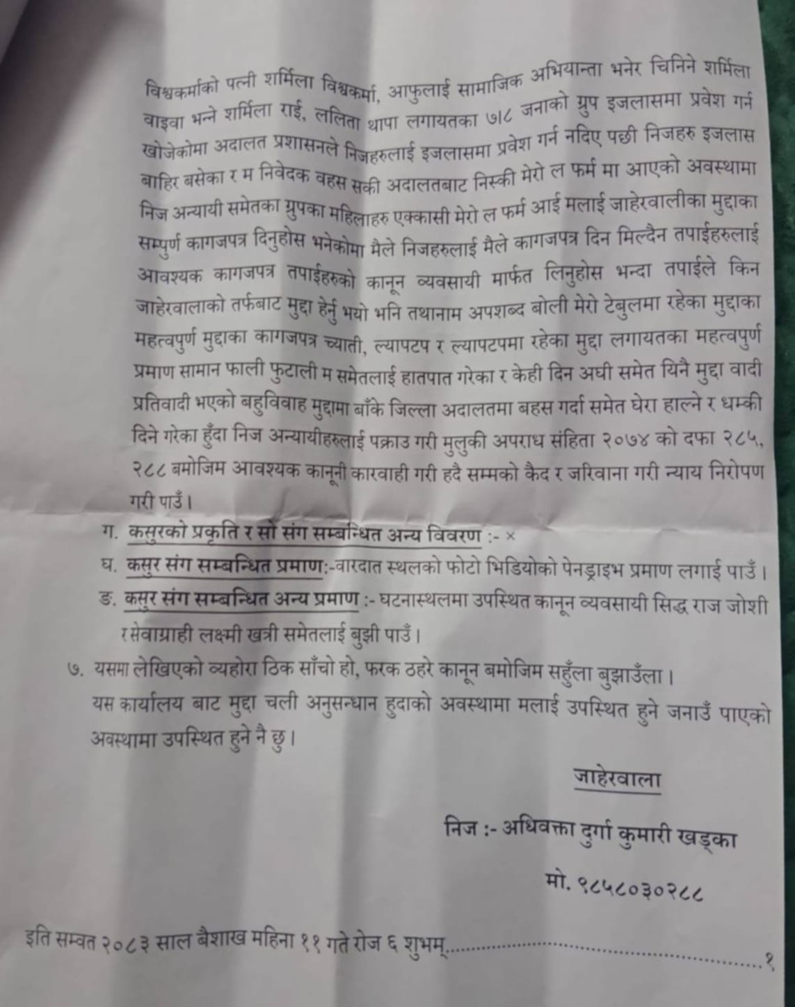 उक्त घटना बारे पीड़ित अधिवक्ता दुर्गा कुमारी खड्काले जिल्ला प्रहरी कार्यालयमा उजुरी समेत दिएकी छिन ।
