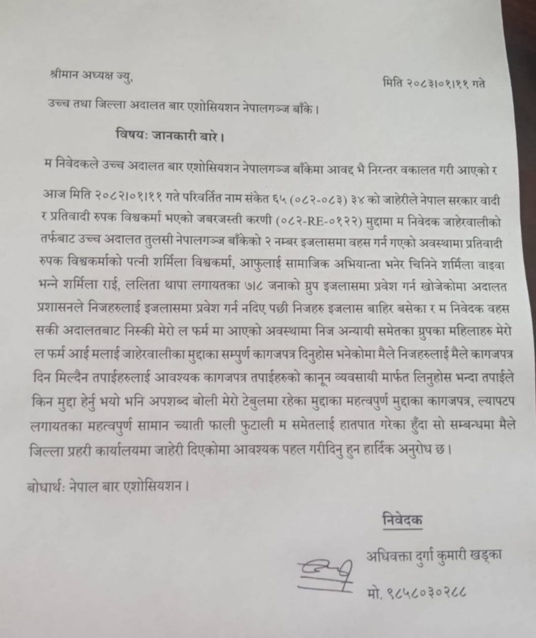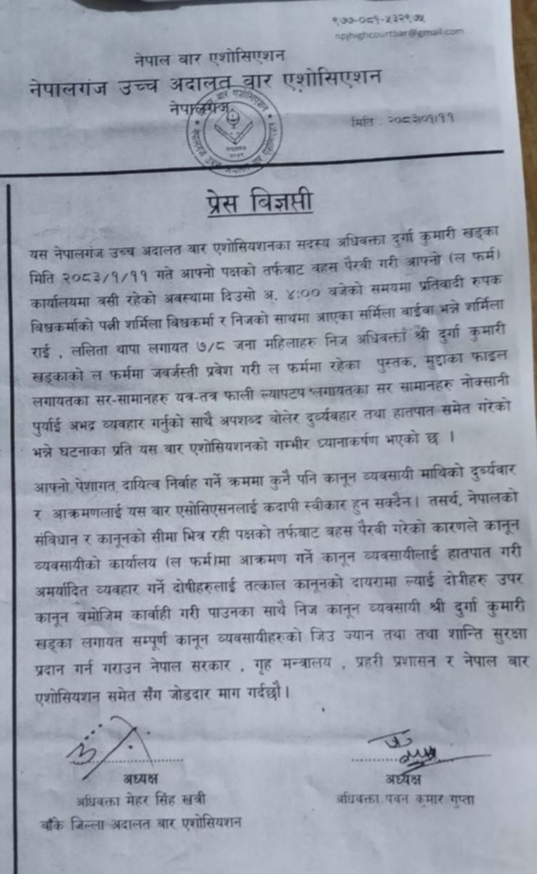 बाँके । नेपालगञ्ज उच्च अदालत बार एशोसियशनका सदस्य अधिवक्ता दुर्गा कुमारी खड्कामाथि हातपात तथा दुर्व्यवहार भएको घटनाप्रति बार एशोसियशनले गम्भीर आपत्ति जनाएको छ।