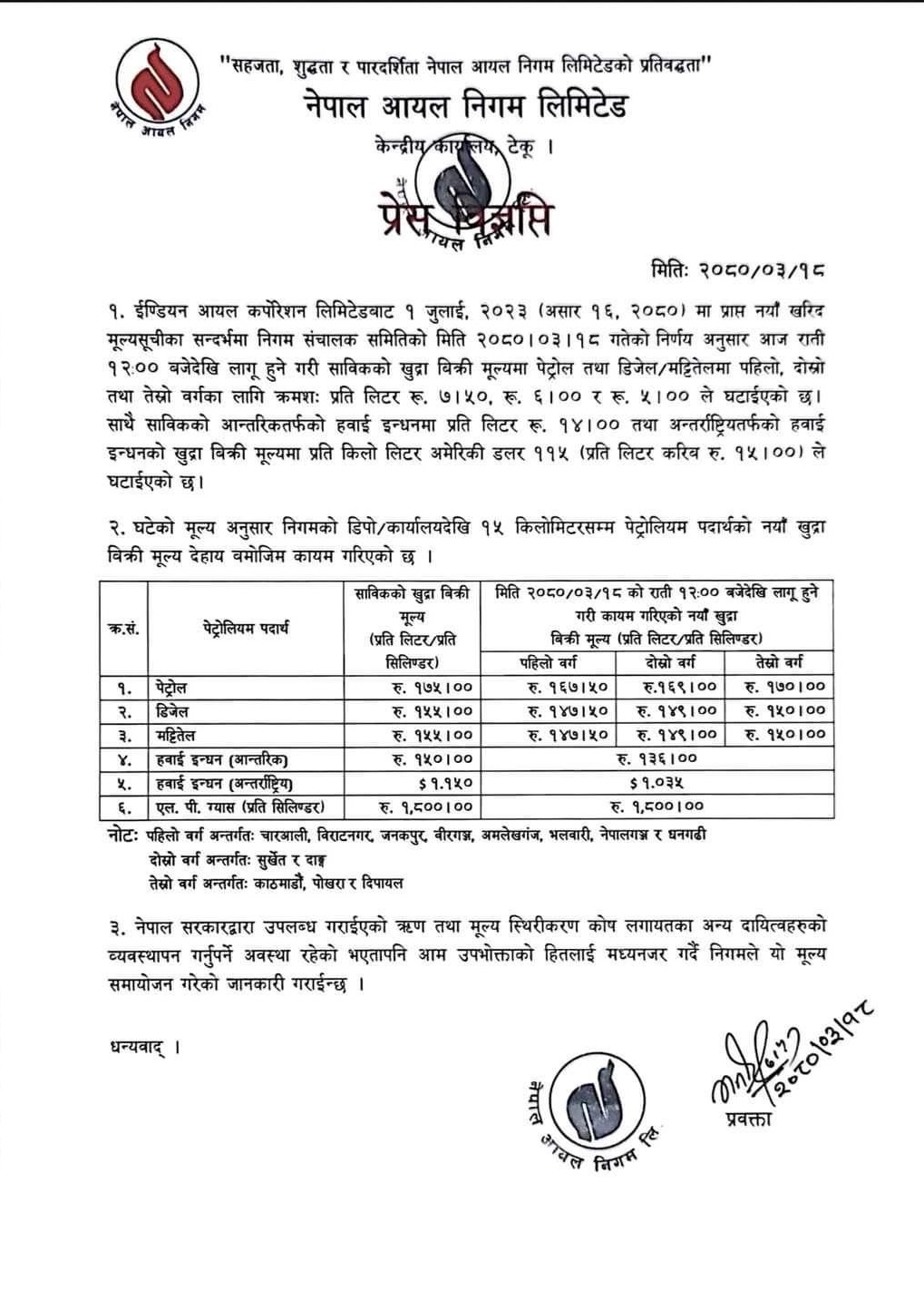पेट्रोलियम पदार्थको मूल्य आज राती देखी घट्ने