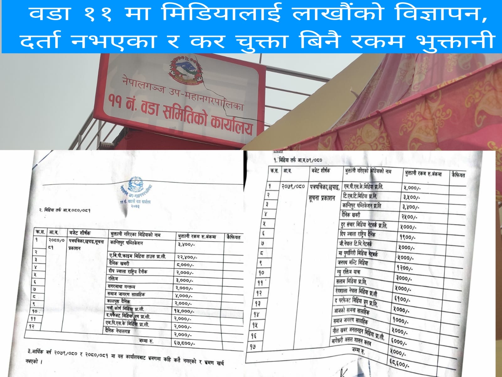 खरिद ऐन विपरित नेपालगञ्जकाे वडा ११ मा मिडियालाई लाखौंको विज्ञापन, दर्ता नभएका र कर चुक्ता बिनै रकम भुक्तानी